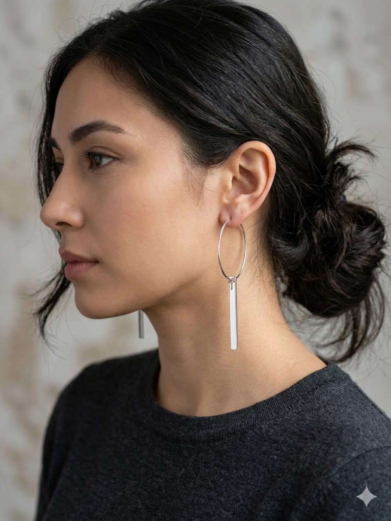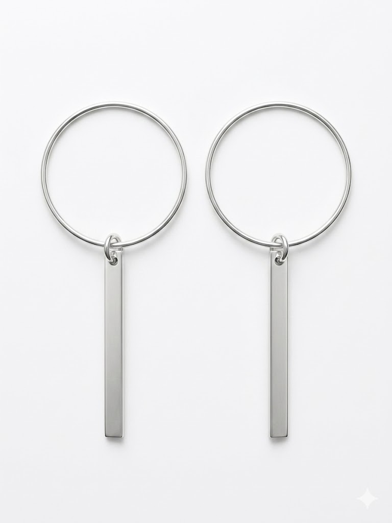 Súmate a la tendencia del minimalismo puro con estos pendientes de diseño lineal. La pieza combina un aro fino y ligero con un colgante en forma de barra rectangular de acabado artesanal. Su estética cruda y honesta, en metal plateado con una textura ligeramente cepillada, evoca un estilo urbano y contemporáneo. Son perfectos para quienes buscan un accesorio que alargue visualmente el cuello y aporte un toque de elegancia sobria y moderna a cualquier conjunto diario.