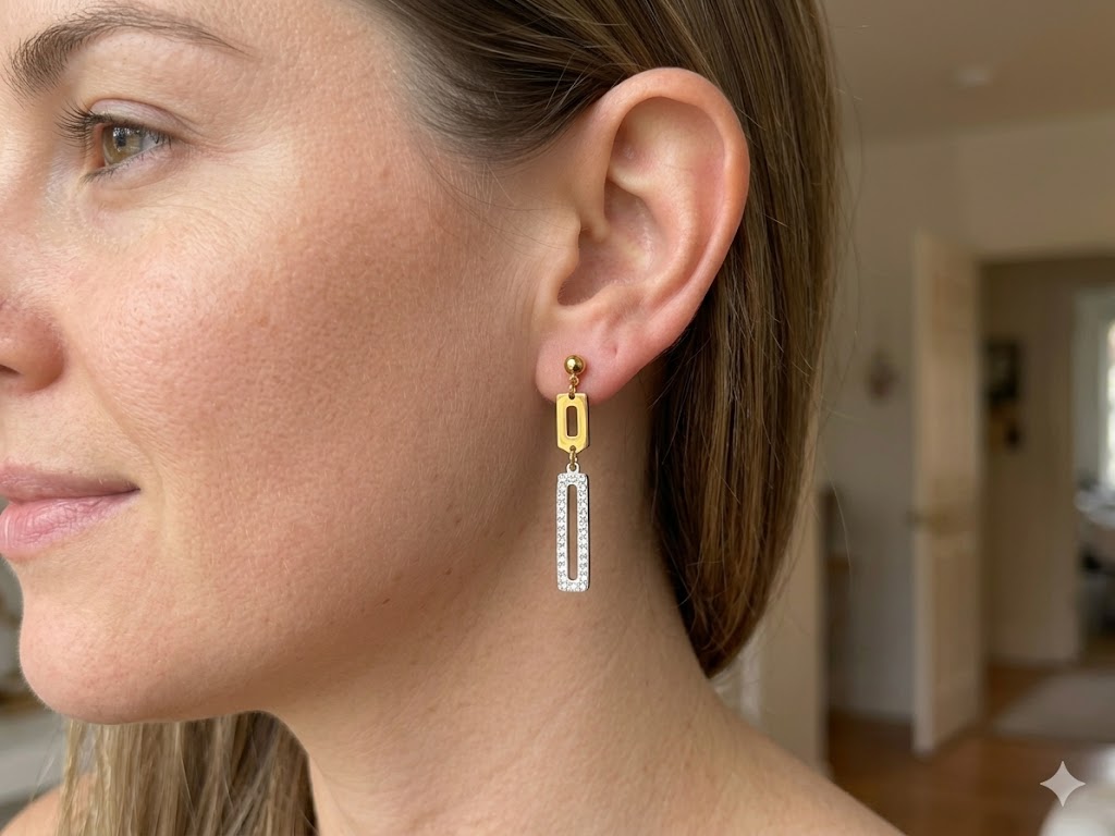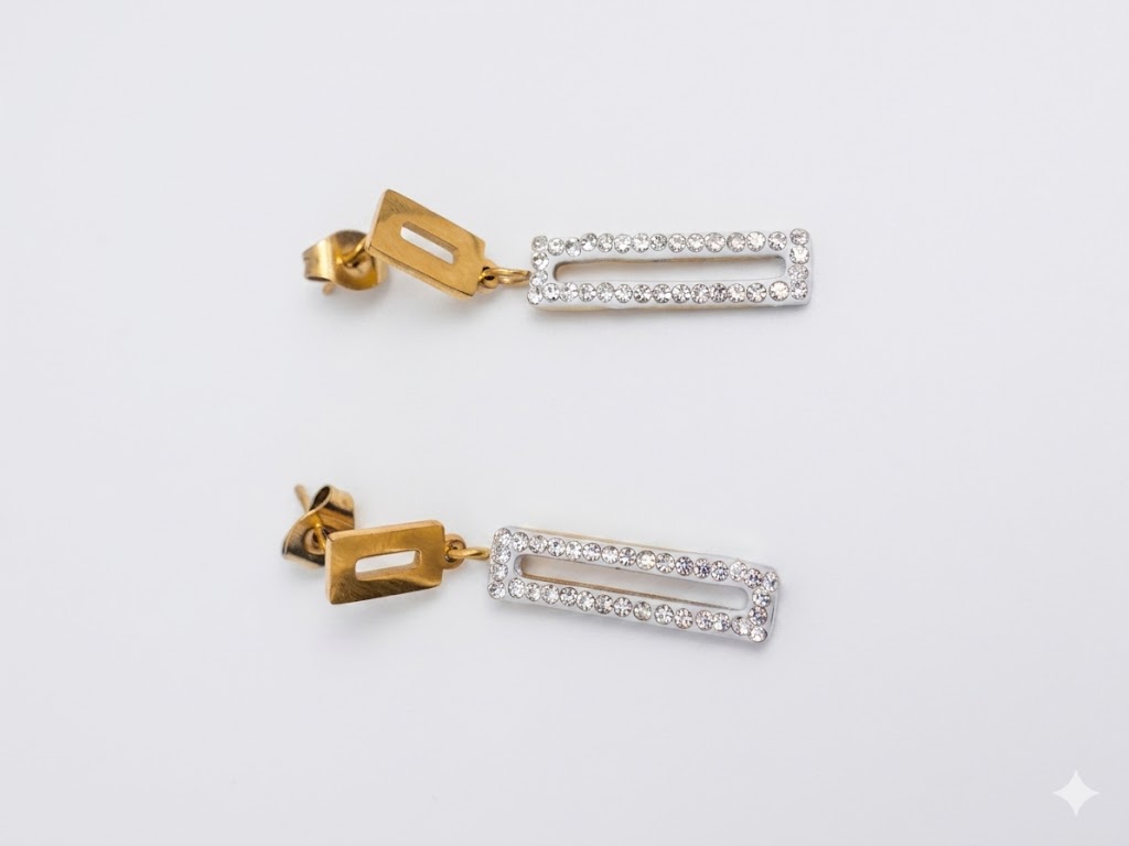 Deslumbra con estos sofisticados pendientes articulados de diseño rectangular. La pieza combina una base geométrica en oro pulido con un colgante alargado, exquisitamente ornamentado con una hilera doble de cristales brillantes sobre un fondo blanco. Su contraste entre el metal dorado y el destello del pavé crea una joya glamurosa y equilibrada, perfecta para iluminar tu rostro en eventos especiales o para elevar un atuendo de noche con elegancia contemporánea.