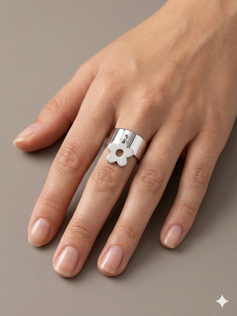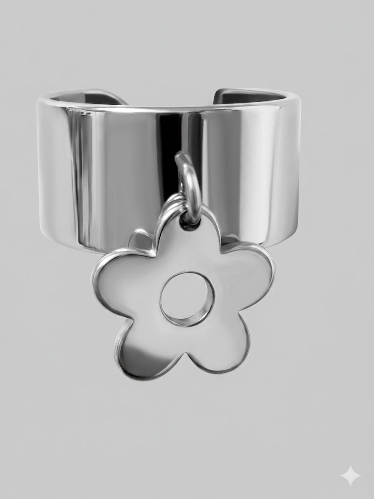 Forjado enteramente en acero inoxidable de alta resistencia, este anillo presenta un acabado pulido de alto brillo que captura la luz con elegancia. Al ser de acero, es una pieza hipoalergénica, resistente al agua y al deslustre, diseñada para acompañarte en tu día a día sin perder su brillo impecable. Es la fusión ideal entre la robustez industrial y la delicadeza floral.