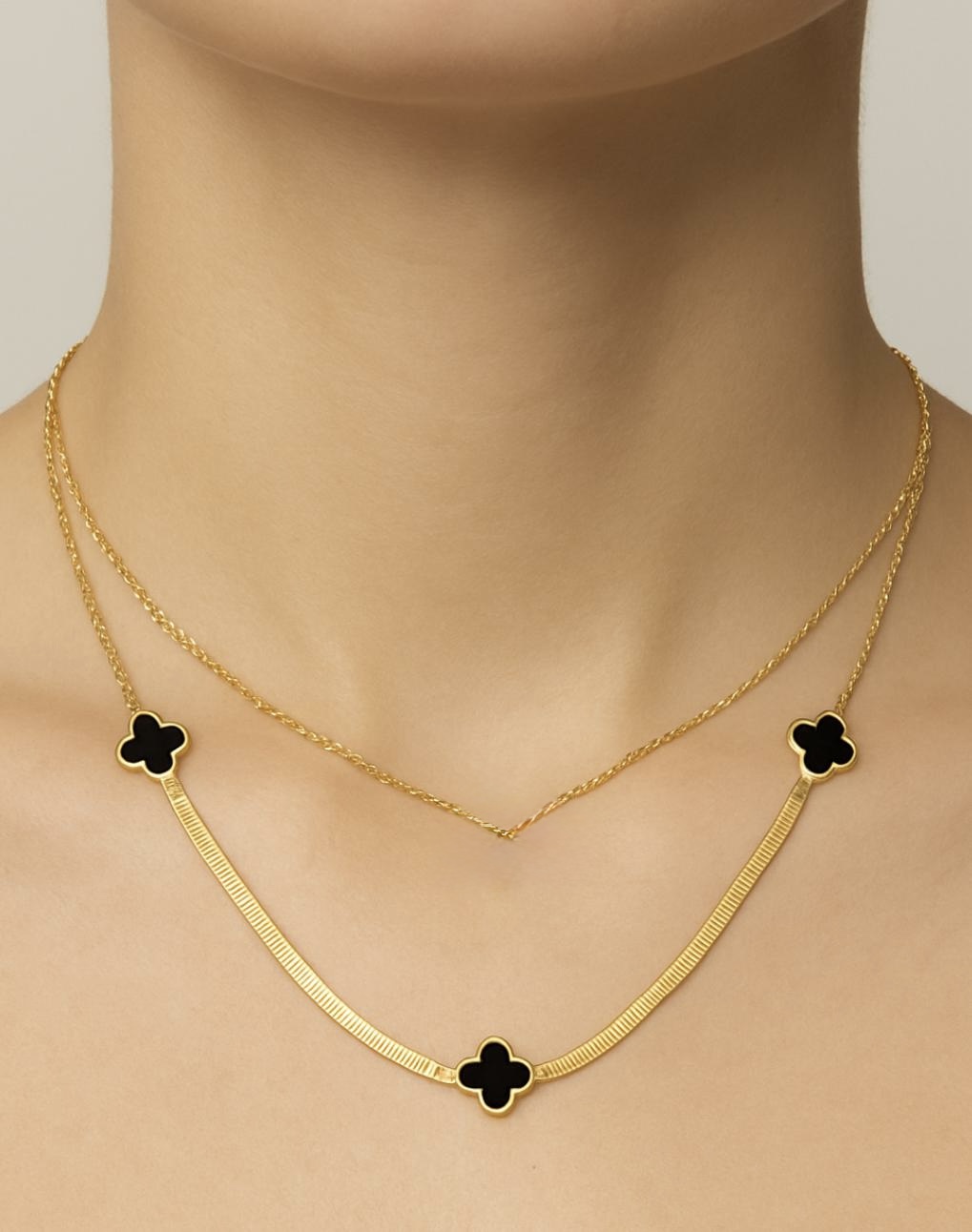 Un diseño sofisticado que combina la calidez del oro con la elegancia del negro. Este collar de doble capa resalta por sus delicados tréboles de ónix que simbolizan fortuna y estilo atemporal. Ideal para elevar cualquier look, desde el más casual hasta el más elegante.