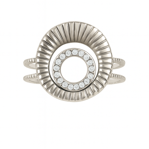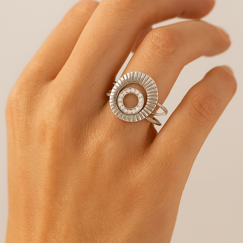 El Anillo Eclipse de Acero Brillante es una pieza única que combina diseño moderno y sofisticación atemporal. Fabricado en acero inoxidable de alta calidad, este anillo presenta un impactante motivo circular doble: un aro exterior con textura acanalada que atrapa la luz en cada movimiento y un aro interior más pequeño, embellecido con circonias engastadas que simulan un destello estelar.
