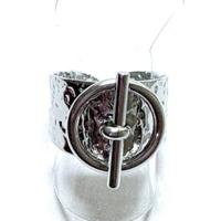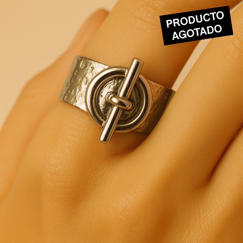Anillo de acero inoxidable con diseño martillado y cierre frontal en forma de círculo y barra. Una pieza audaz y contemporánea que combina fuerza y elegancia, ideal para destacar en cualquier look con un toque moderno y sofisticado.