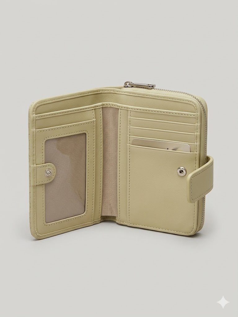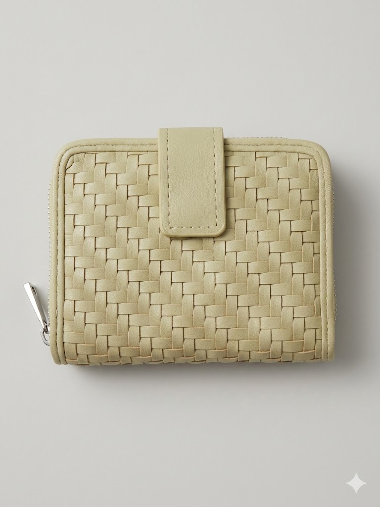 Mantén todo en su lugar sin sacrificar el estilo con la Billetera Compacta Trenzada «Ethereal». De un tono verde pálido relajante y un patrón trenzado distintivo, esta billetera es la solución ideal para quien busca organización en poco espacio. Su cierre de solapa con botón a presión mantiene tus pertenencias seguras. El interior cuenta con espacios dedicados para tus tarjetas principales, un compartimento para billetes o recibos, y un bolsillo central con cremallera metálica para guardar monedas o pequeños objetos. Práctica, ligera y con un toque de diseño artesanal, cabe perfectamente en tu bolso de mano o de hombro.
