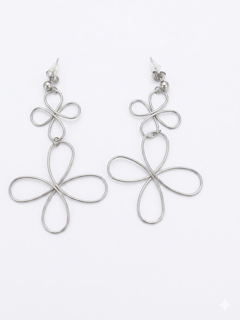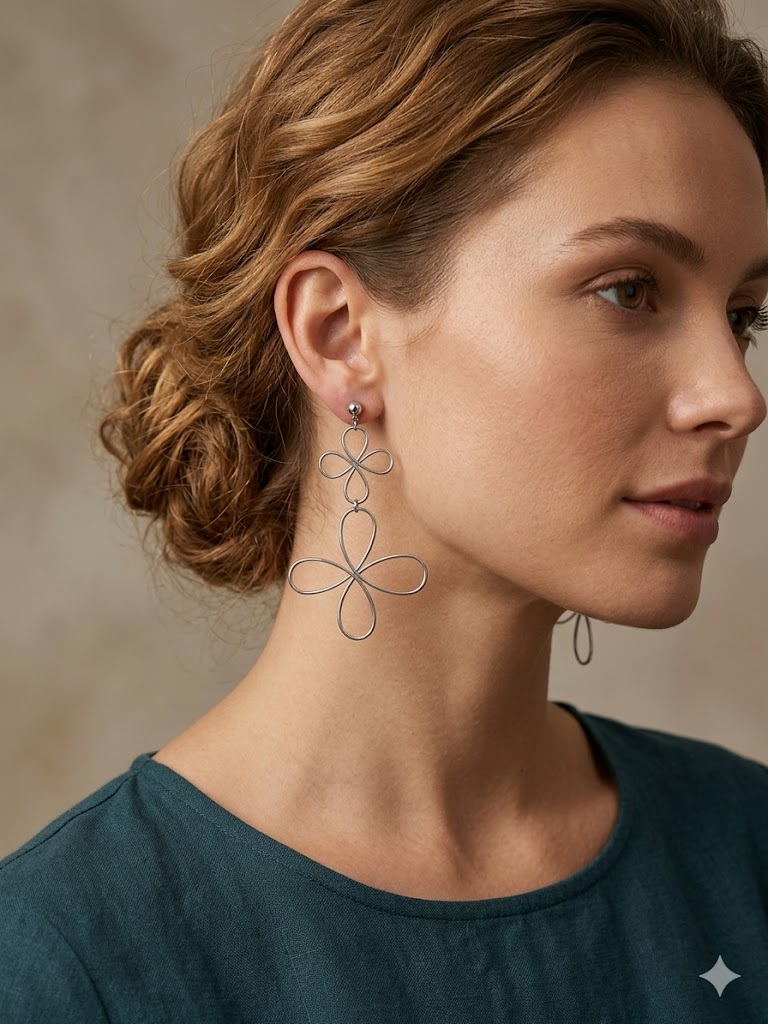 Deslumbra con la delicadeza de estos pendientes XL de diseño filigrana. Con una estructura ligera de hilo metálico plateado, estas piezas presentan una composición articulada de dos flores estilizadas que parecen flotar con el movimiento. Su estética minimalista y orgánica aporta un toque romántico y artístico sin resultar pesada, convirtiéndolos en el accesorio perfecto para elevar un evento especial o añadir un toque bohemio y sofisticado a tu estilo diario.