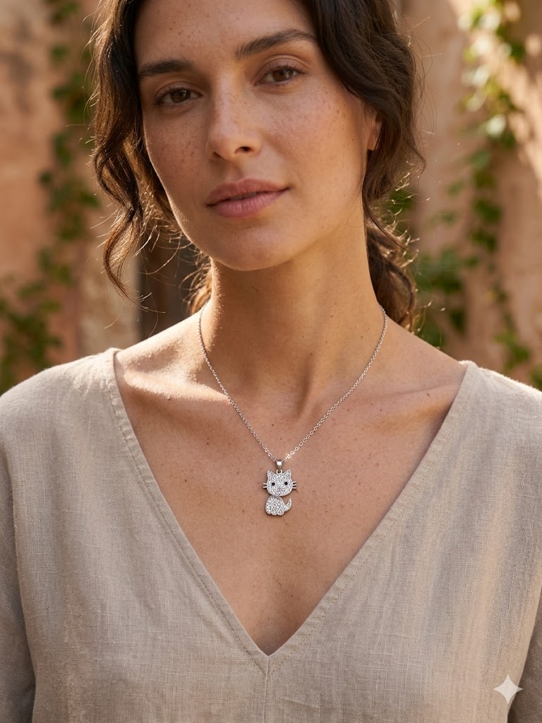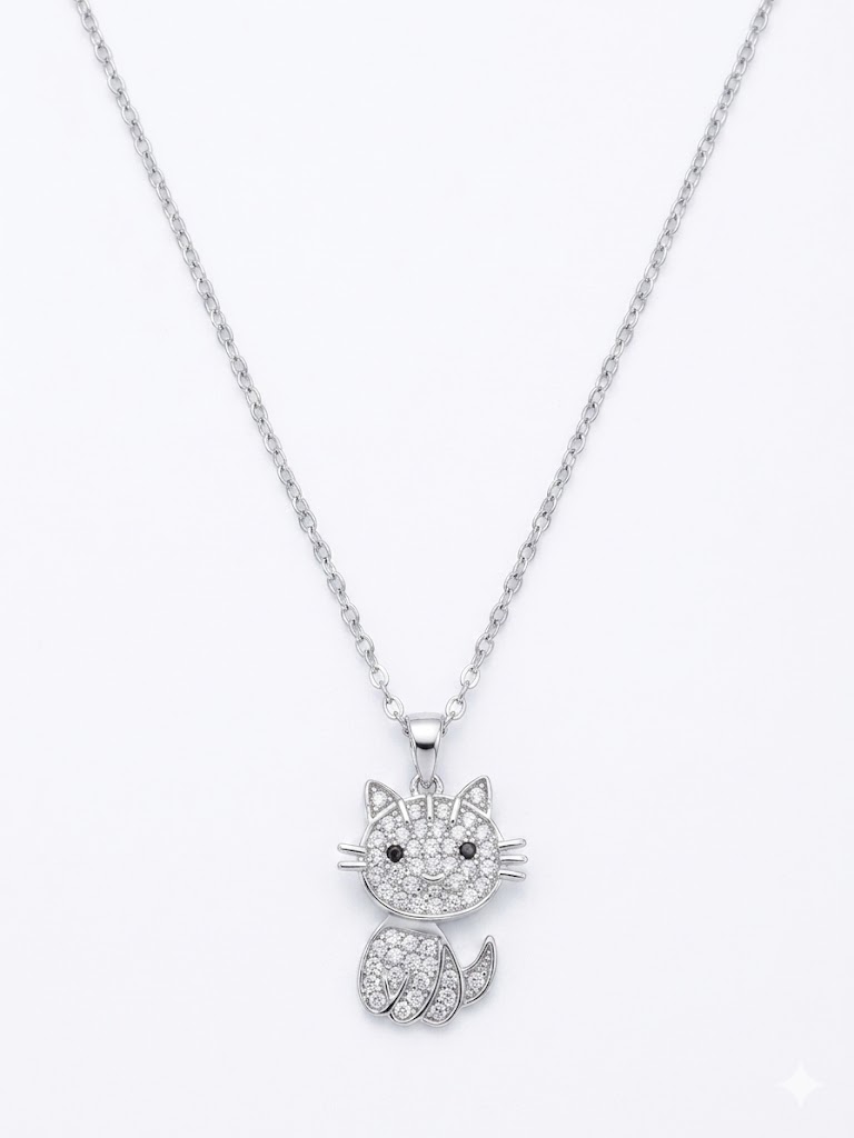 Celebra tu amor por los felinos con este adorable collar de plata. El colgante presenta un gato sentado en una postura graciosa, meticulosamente adornado con circonitas brillantes que capturan la luz con cada movimiento. Dos circonitas negras más pequeñas actúan como ojos, añadiendo un toque de expresión y encanto a este diseño juguetón. El colgante cuelga de una delicada cadena de eslabones de alta calidad, perfecta para el uso diario o para regalar a cualquier amante de los gatos. Su diseño atemporal y elegante lo convierte en un accesorio versátil para cualquier ocasión.