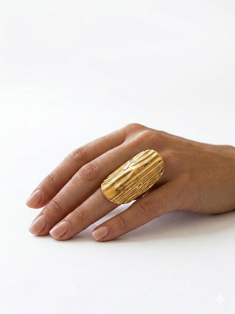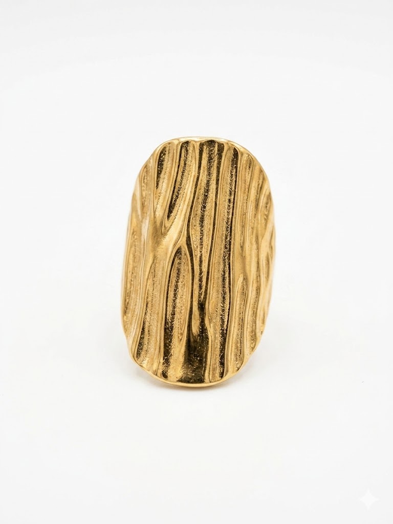 Eleva tu estilo con el anillo Gold Ripple, una pieza de diseño audaz que captura la esencia de las texturas naturales. Este anillo destaca por su amplia superficie ovalada y curva, que presenta un intrincado patrón de estrías irregulares y onduladas que evocan la corteza de un árbol o las ondas en el agua. El contraste entre los relieves brillantes y las zonas más sombreadas crea un efecto visual de gran profundidad y sofisticación.