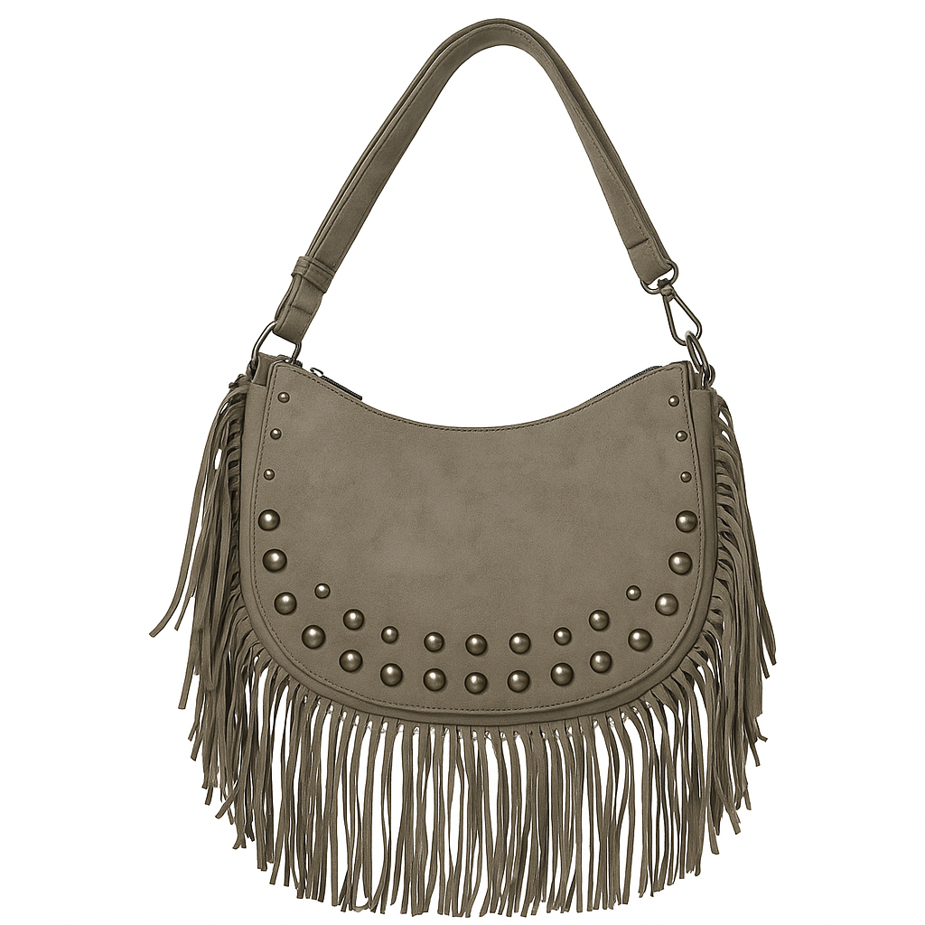 El Bolso Grey Fringe Boho es un accesorio con mucha personalidad que combina el estilo bohemio con un toque de sofisticación moderna. Su material tipo ante en un elegante tono grisáceo aporta versatilidad, mientras que los flecos largos y los apliques metálicos añaden movimiento y carácter único. Un bolso pensado para convertirse en el protagonista de cualquier outfit.
