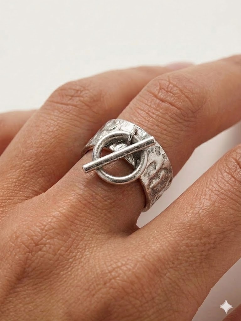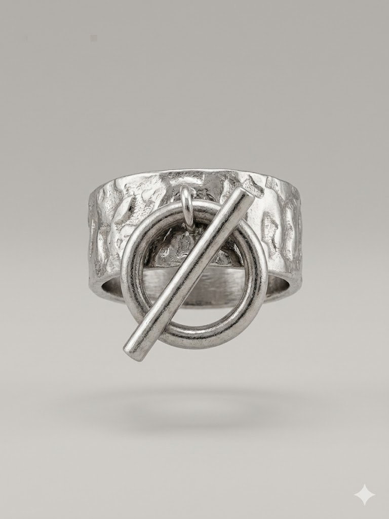 Rompe con lo convencional con el anillo Industrial T-Bar, una pieza que celebra la estética brutalista y el diseño funcional. Este anillo destaca por su banda ancha de textura orgánica martillada, que sirve de base para un llamativo cierre tipo «T» (Toggle) colgante, un detalle icónico de la joyería clásica reinterpretado aquí con un aire rebelde y moderno.