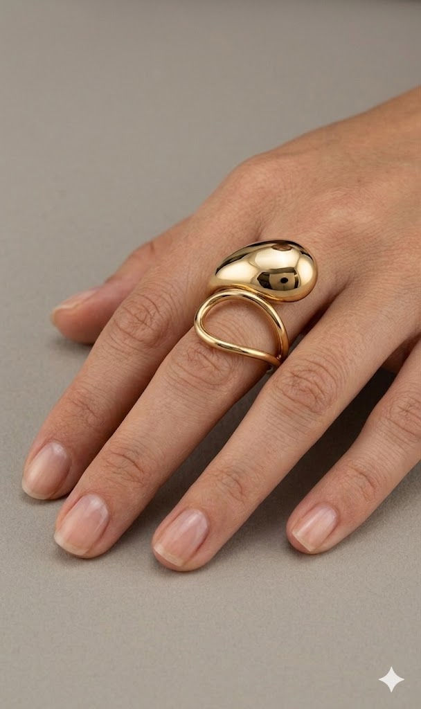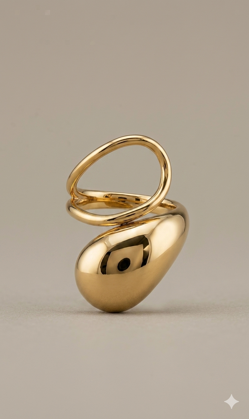 Define tu estilo con una pieza que es puro arte. El anillo Liquid Gold presenta un diseño orgánico y asimétrico, inspirado en la fluidez del metal fundido. Su estructura combina una banda minimalista con un elemento central voluminoso y suavemente redondeado que crea un impacto visual inmediato.