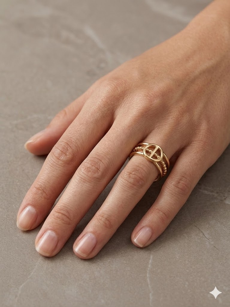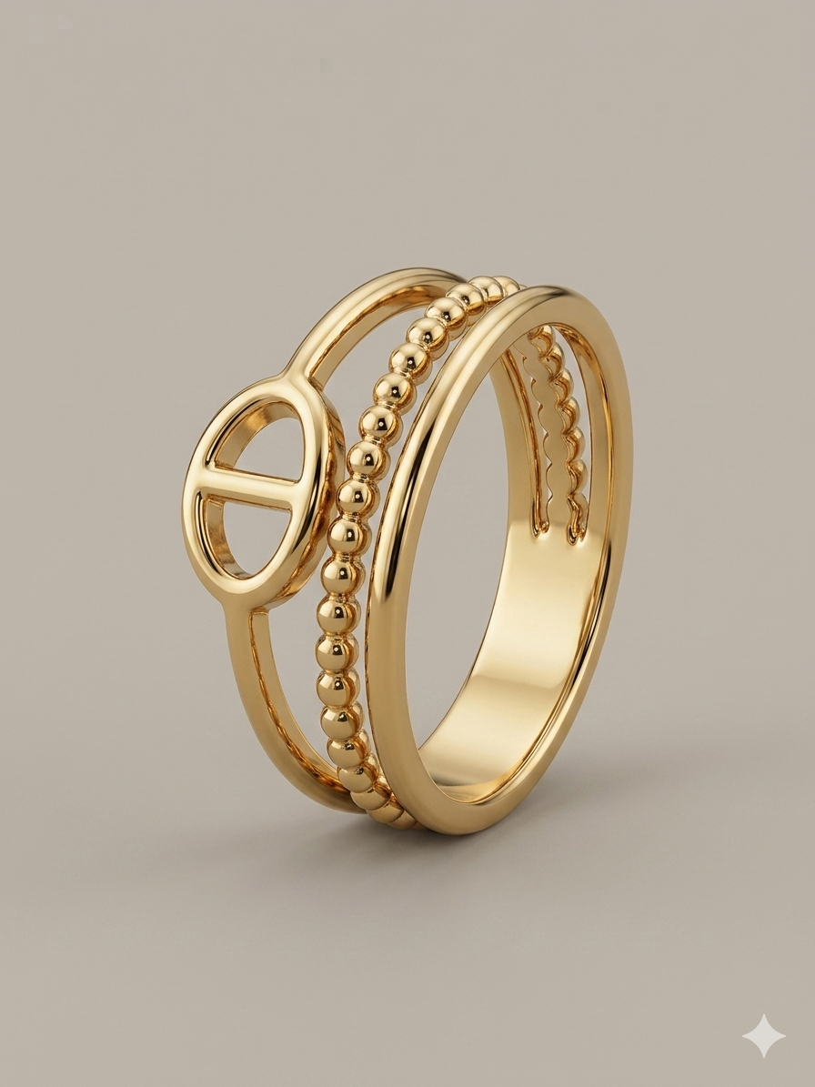 Descubre el equilibrio perfecto entre audacia y elegancia con nuestro anillo Marine Link. Esta pieza destaca por su diseño de triple banda unificada: una banda lisa clásica, una banda de bolitas (beaded) y una banda frontal que luce el icónico eslabón tipo ancla.