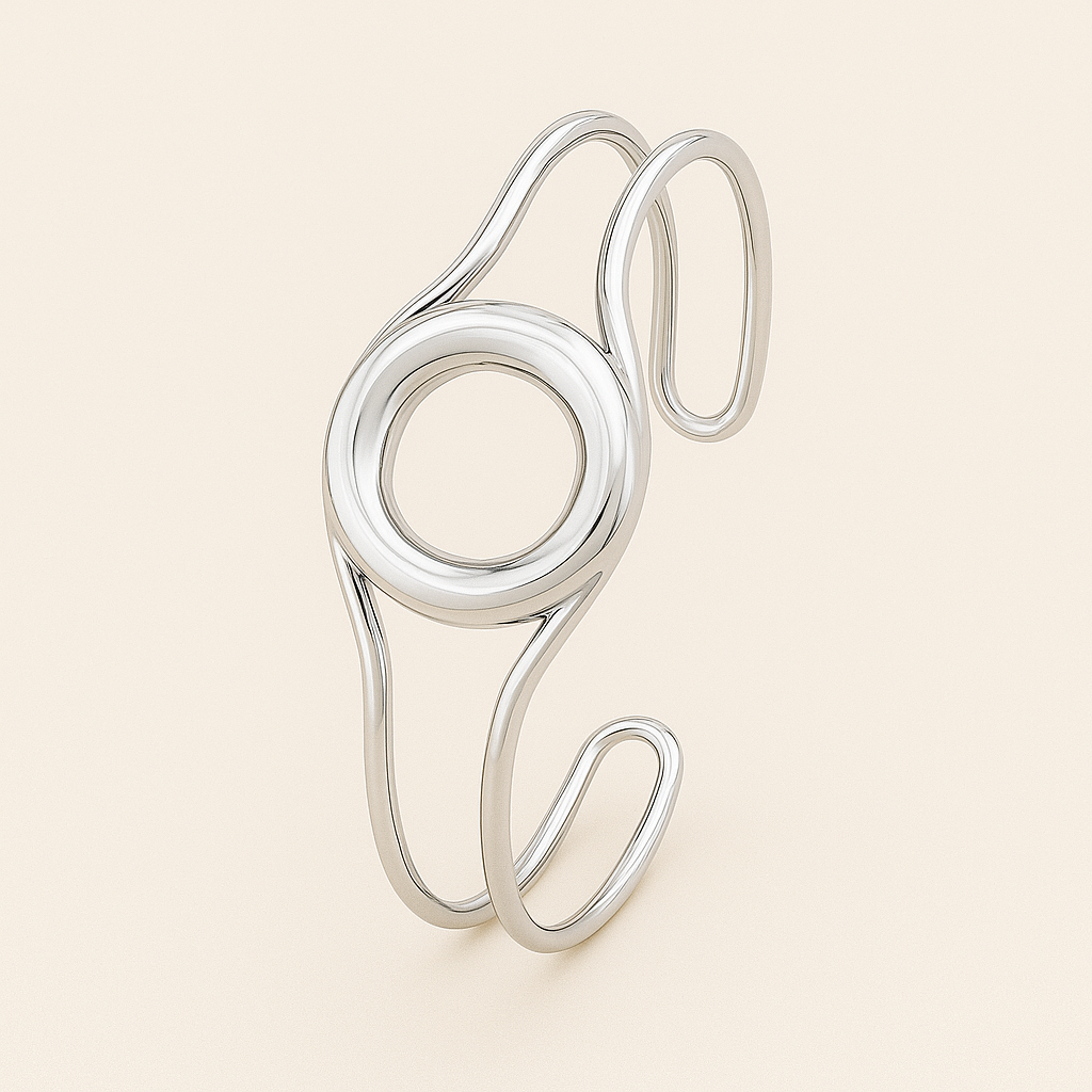 Un diseño moderno que combina fuerza y elegancia. El Brazalete Orbit Steel está fabricado en acero inoxidable pulido de alta calidad, lo que garantiza durabilidad, resistencia y un brillo impecable. Su diseño de líneas curvas envuelve la muñeca con ligereza, mientras que el círculo central simboliza equilibrio, unidad y estilo atemporal.