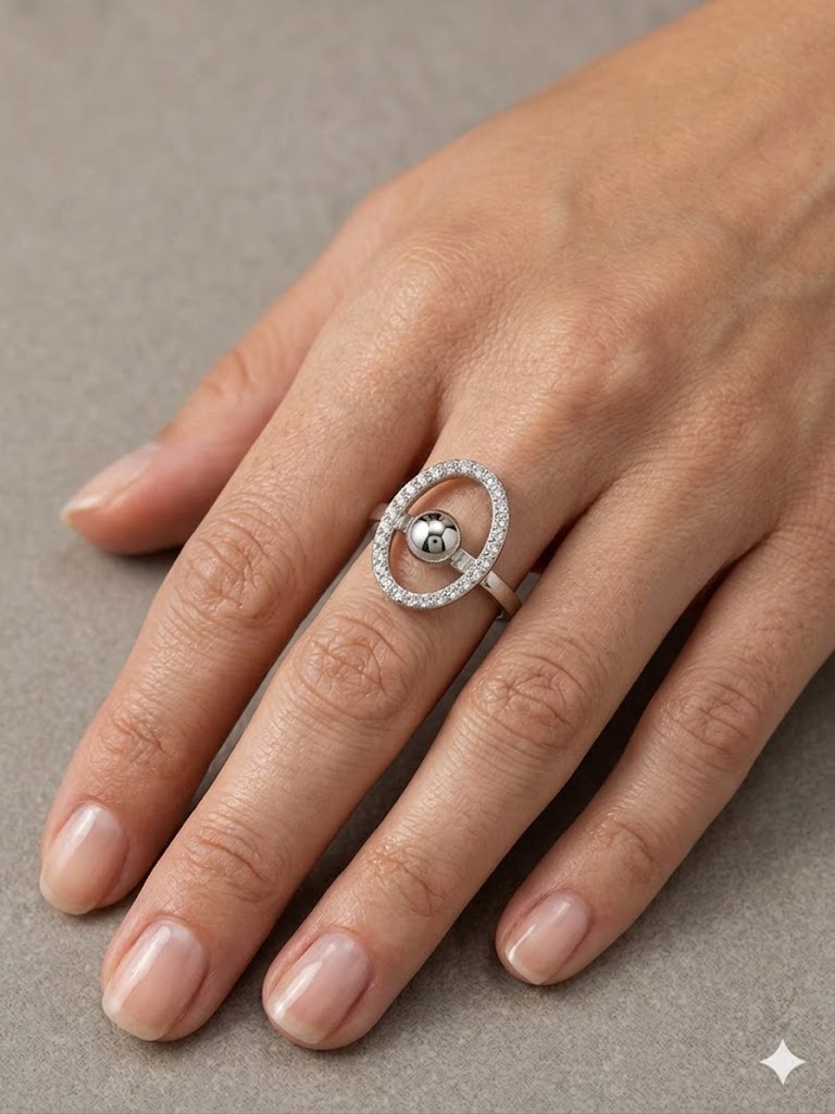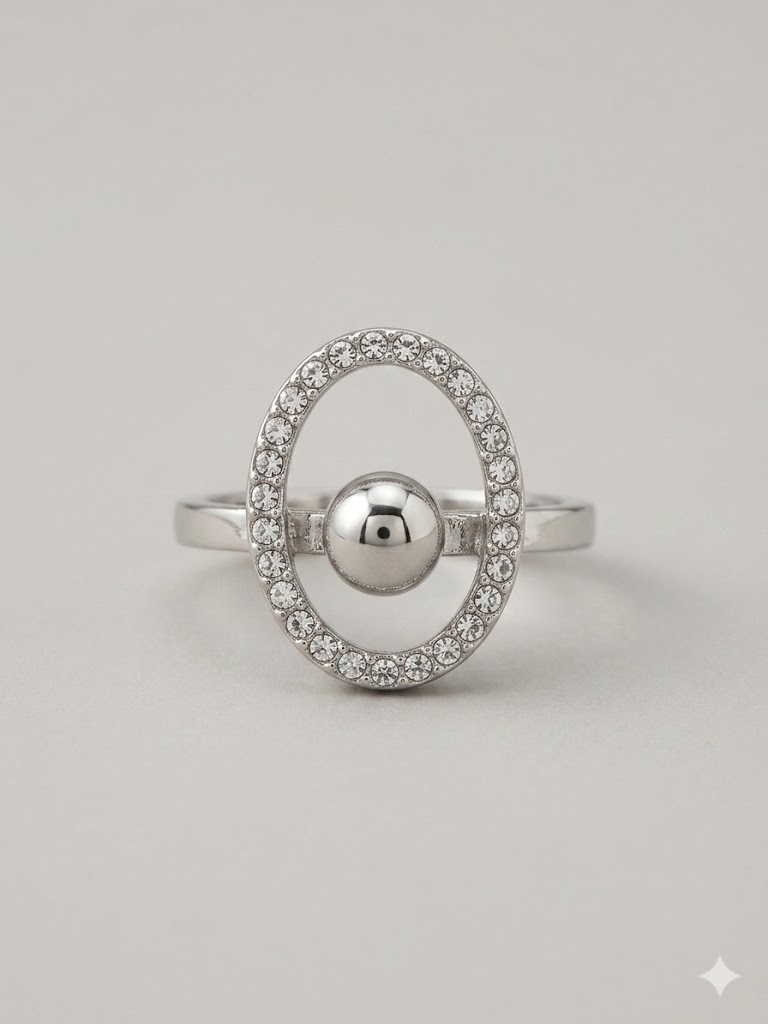 El equilibrio perfecto entre la precisión geométrica y el brillo clásico. El anillo Orbital Halo destaca por su diseño de marco ovalado, delicadamente engastado con un pavé de cristales brillantes, que rodea una esfera central pulida de efecto espejo.