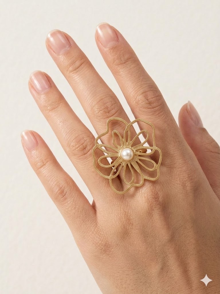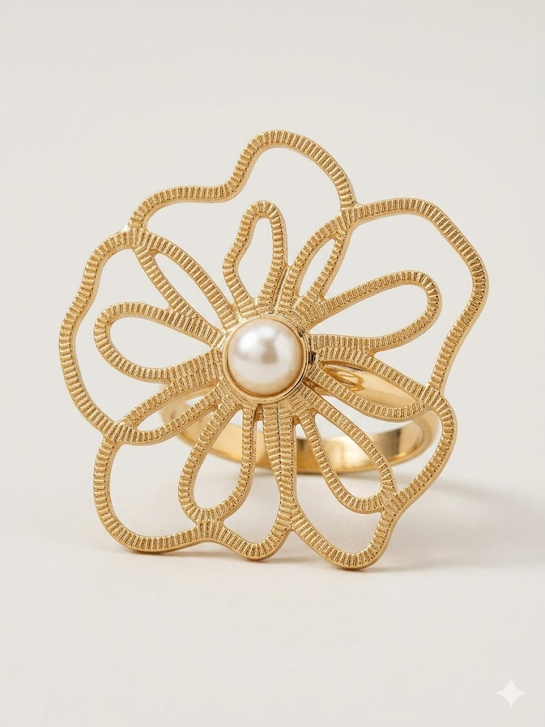 Eleva tu estilo con el anillo Petal Symphony, una pieza que combina la delicadeza orgánica con una sofisticación vanguardista. Este anillo presenta un diseño calado de gran formato en forma de flor, meticulosamente elaborado con una textura lineal que aporta profundidad y carácter. En el centro de esta sinfonía visual, reposa una perla cultivada esférica de tono marfil, añadiendo un toque clásico y atemporal.