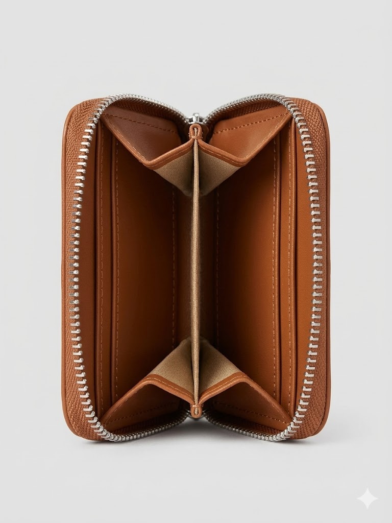 Al abrirlo, revela su verdadera versatilidad: tres ranuras interiores para tarjetas de crédito, un compartimento transparente con ventana de identificación para acceso rápido a tu DNI o fotos, y un bolsillo central con cremallera de metal plateado y tirador minimalista para monedas. Con un perfil compacto que cabe en cualquier bolso, es la combinación perfecta de diseño artesanal y organización moderna.