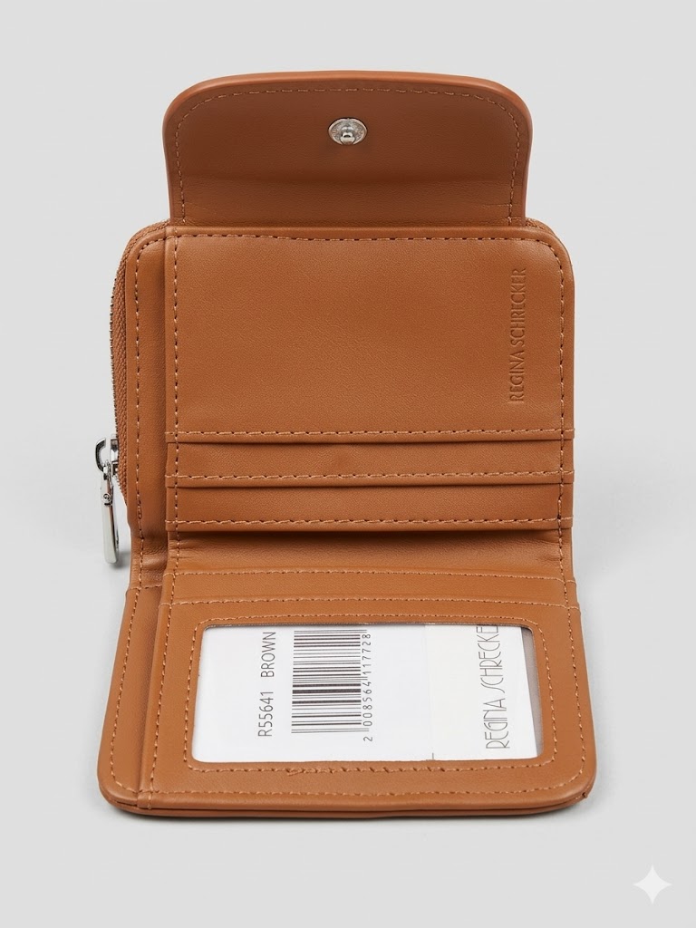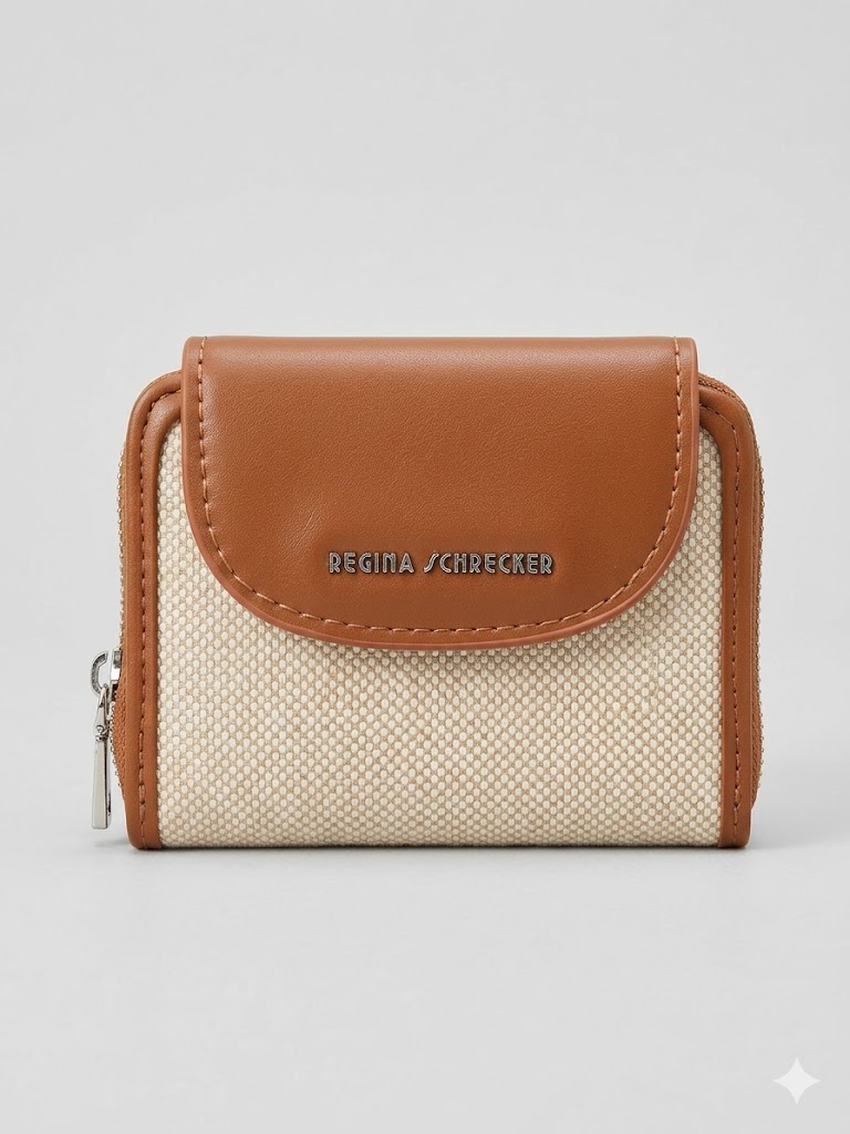 Eleva tus esenciales diarios con el Monedero Regina Schrecker. Este accesorio bifold es la definición de diseño funcional chic. El exterior combina un panel de lienzo texturizado de alta calidad con una solapa de piel sintética en un cálido tono marrón, asegurada por un cierre de botón a presión. El icónico logotipo «Regina Schrecker» en metal plateado pulido adorna la solapa exterior, aportando un toque de exclusividad.