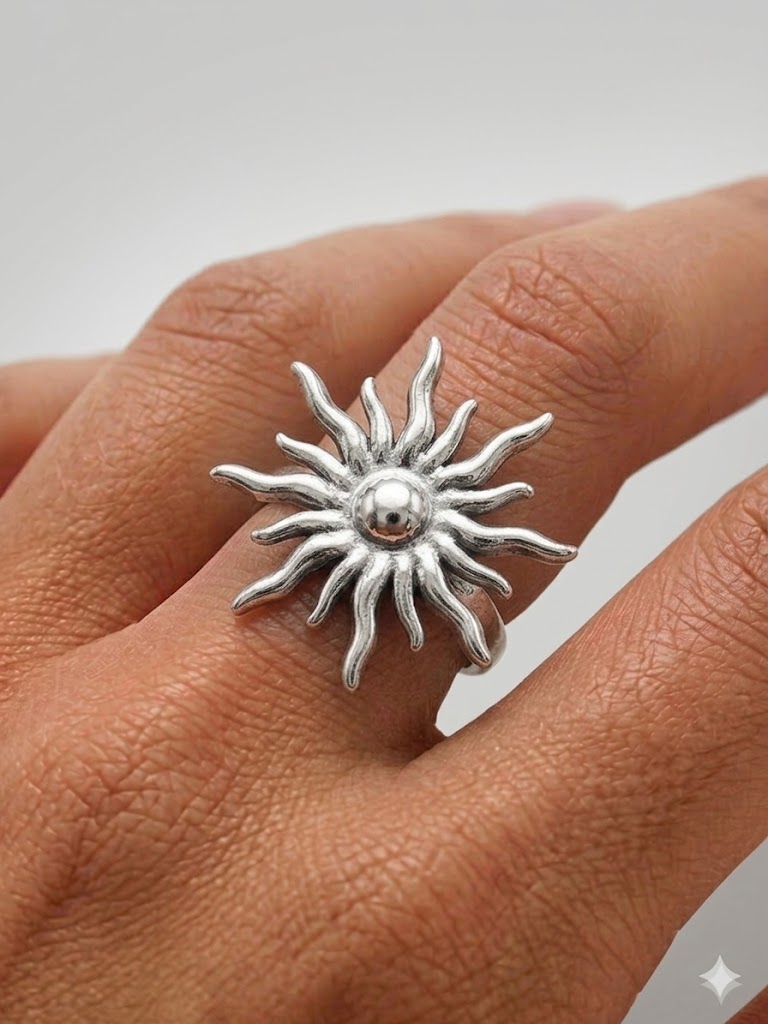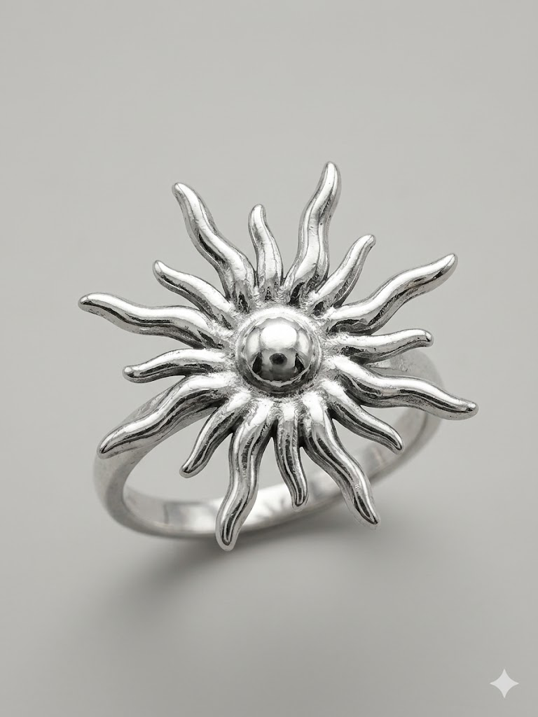 Ilumina tu estilo con la fuerza del anillo Sun Ray, una pieza que captura la esencia del sol en un diseño escultural y lleno de energía. Este anillo destaca por su motivo central de rayos ondulados que irradian desde una esfera pulida, creando un efecto visual dinámico y místico.