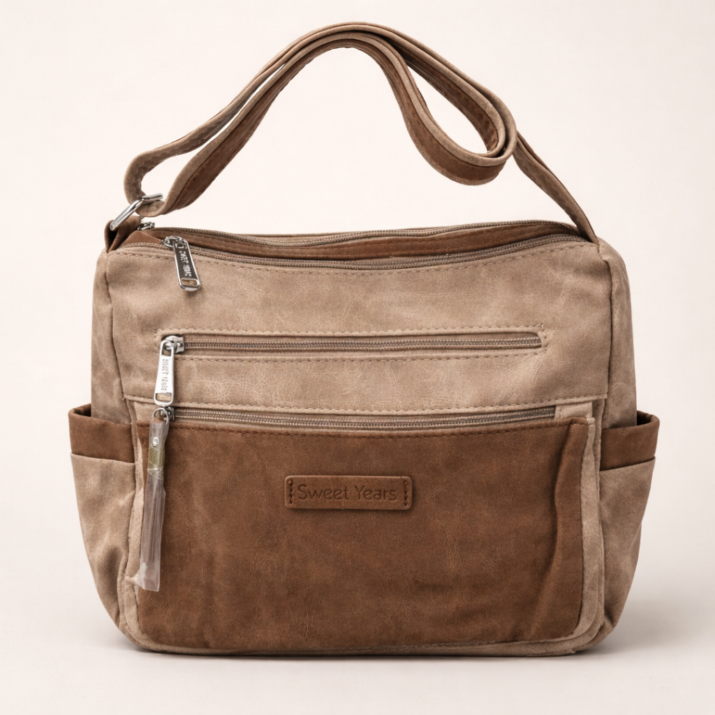 Su diseño práctico incluye múltiples bolsillos con cierre de cremallera, ideales para mantener tus pertenencias organizadas y seguras. La correa ajustable permite llevarlo cómodamente al hombro o cruzado, adaptándose a tu ritmo y estilo. Los detalles metálicos en color plata y el logo discreto de Sweet Years añaden un toque moderno y sofisticado.