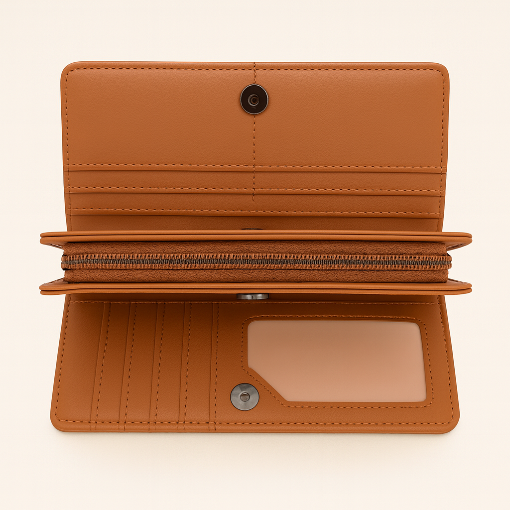 La billetera The Best Bag destaca por su diseño moderno y funcional. Fabricada en cuero sintético texturizado de alta calidad, presenta un tono caramelo cálido y elegante. Su grabado en relieve con la frase “THE BEST BAG” añade un toque distintivo y contemporáneo. Cuenta con cierre completo de cremallera metálica y compartimentos internos amplios para tarjetas, billetes y monedas. Perfecta para quienes buscan estilo, organización y durabilidad en un solo accesorio.